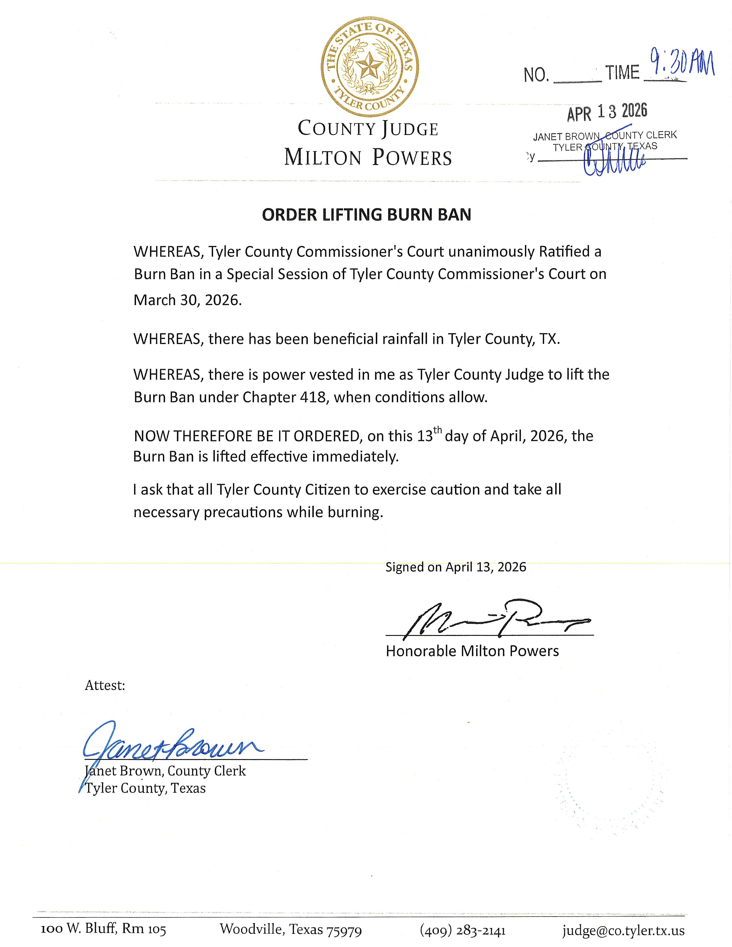 Order to Rescind Ratified Burn Ban Put into Place on March 30, 2026