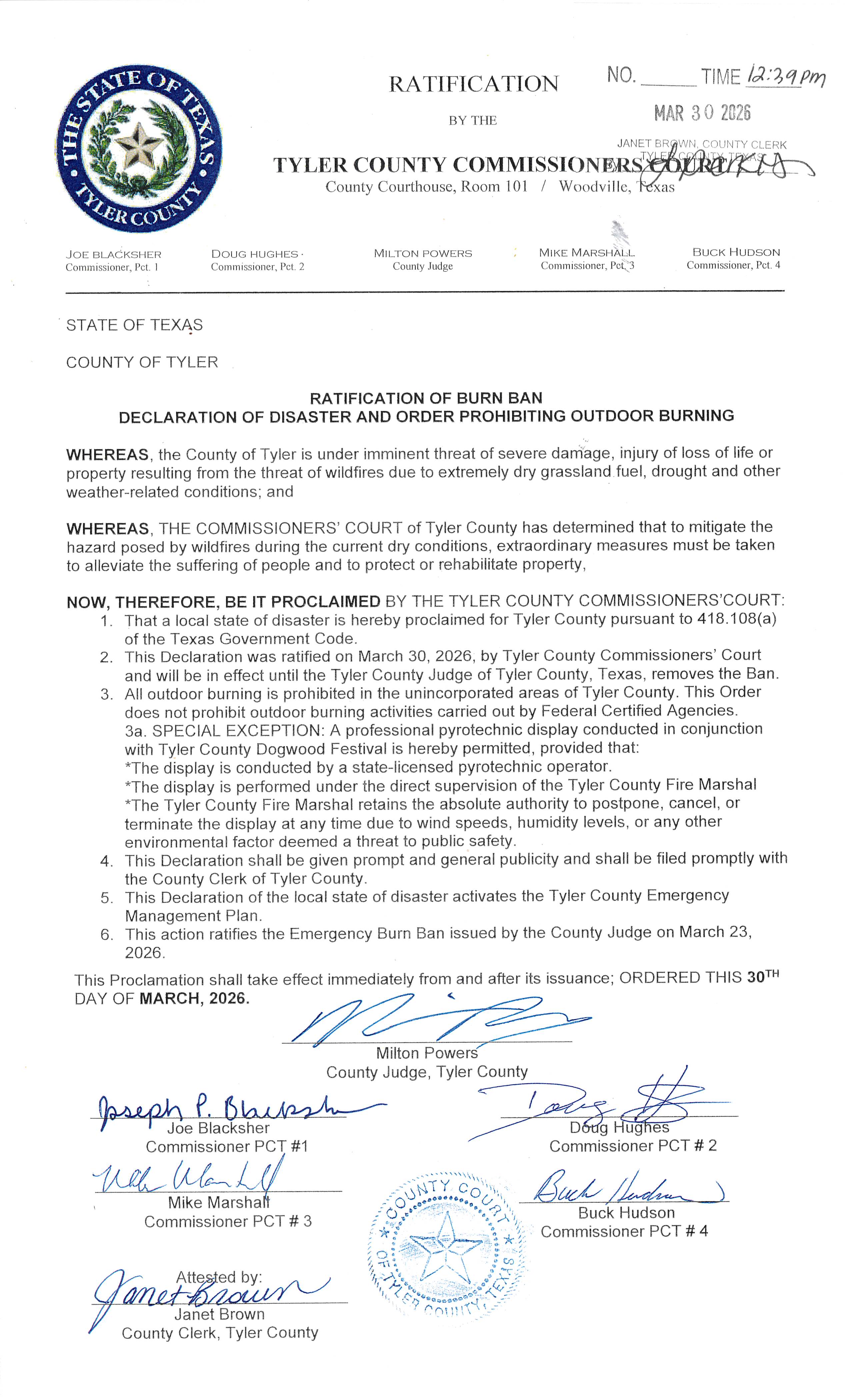 Ratification of Burn Ban Order Put into Place on March 23, 2026